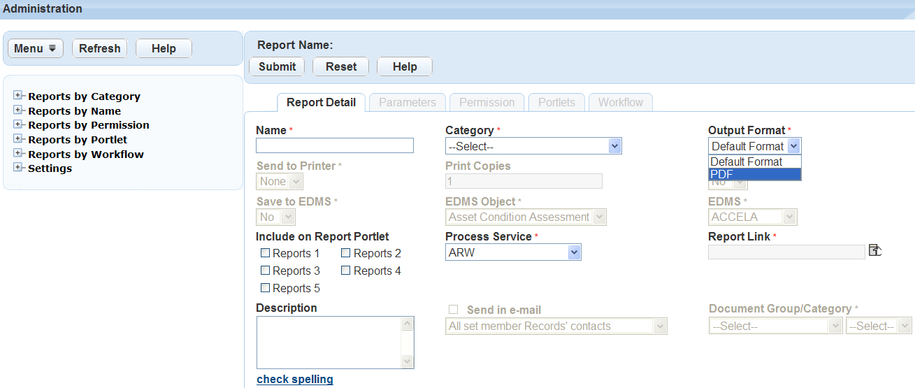 Updates to the Report Service Name and Report Output Formats change the options that appear in the Report Detail form. For example, if you clear the check box for the Adobe Acrobat (PDF), this option is no longer available for reports using that report service.