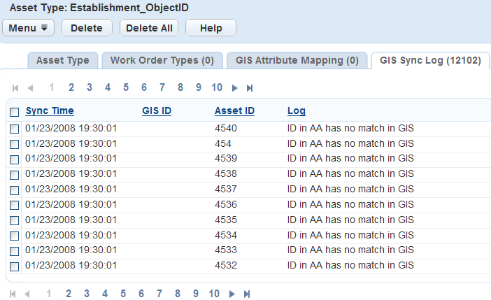 After the GIS asset sync is complete, click the GIS Sync Log tab to view any errors from the synchronization. Error messages are listed by date, time, and asset ID.