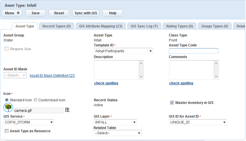 If you want to synchronize only one asset type, select the asset type on the list, and click Sync with GIS on the Asset Type detail pane below the asset type list. For example: