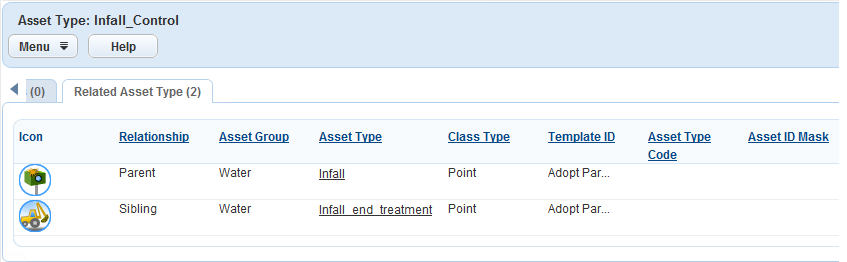 After you map a feature class and its related tables in the geodatabase to asset types in Civic Platform, the Related Asset Type tab appears and lists all related asset types for every asset type in the parent and child hierarchy. The Related Asset Type tab is not available for the asset type that does not participate in any relationships with other asset types.
