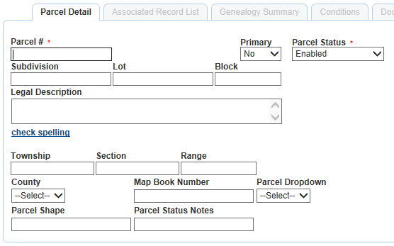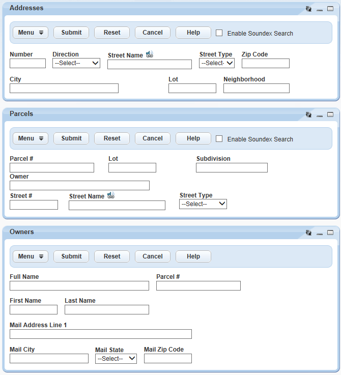5. Enter address, parcel, or owner data into the form fields. For field descriptions, refer to Table 1, Table 3, and Table 5.