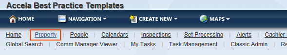 Civic Platform displays the Property page, which is comprised of the Address, Parcel, and Owner portlets.