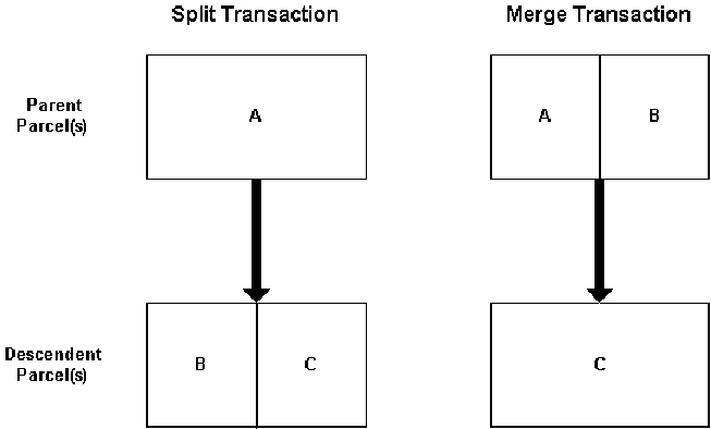 Civic Platform provides parcel genealogy functionality that lets you keep a history of parcels on your system and the applications associated with those parcels. Civic Platform supports several types of relationships that you can establish between existing parcels (Parcel Genealogy Transactions). For example, you can split a parent parcel into multiple descendents, or you can merge parcels together in a spousal relationship. You can also choose to combine multiple parcels into a single descendent. Each time you establish a relationship between parcels, Civic Platform records your action as a genealogical transaction.
