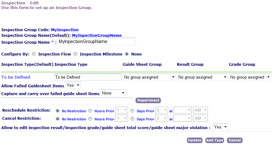 The inspection types specify the checklist group, result group and grade group, which provide the guidelines to follow for performing the actual inspection and for resulting the inspection score, inspection status, and inspection grade. You can define your inspection types to automatically schedule inspections and assign them the appropriate inspectors.