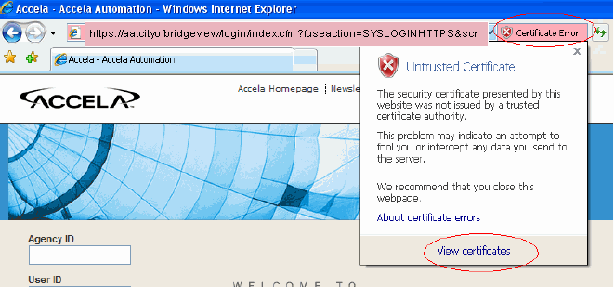 In Civic Platform you must install security certificates. After the installation, the certificate error does not block browser navigation, so that you can easily access Civic Platform.