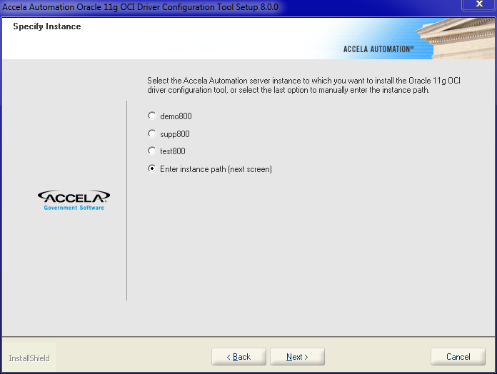 The Specify Instance screen displays, with all the Civic Platform server instances that the InstallShield Wizard detects.