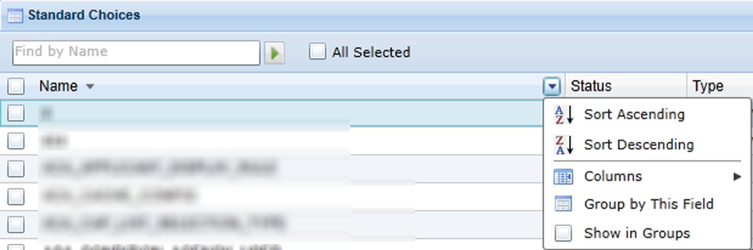 • Click the column headings to activate the column filters. Use column filters to sort columns alphabetically, show and hide specific columns, and group the display based on column names.