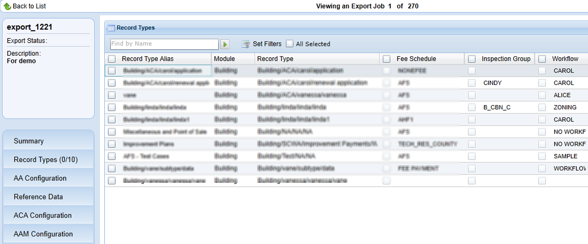 When you select record types for inclusion in an import or export job, the related data from the record type is automatically selected in the relevant configuration sections of the tool. For example, if a record type is selected and saved, the same Fee in that record type is automatically selected in the Fee section of AA Configuration.