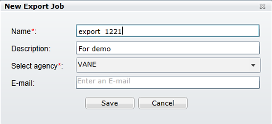 Select Agency The source agency used to create the export job. The default agency name that displays in this field is the current agency. If you have multiple agencies and you log in using the parent agency, then all the child agencies display in this drop-down list.