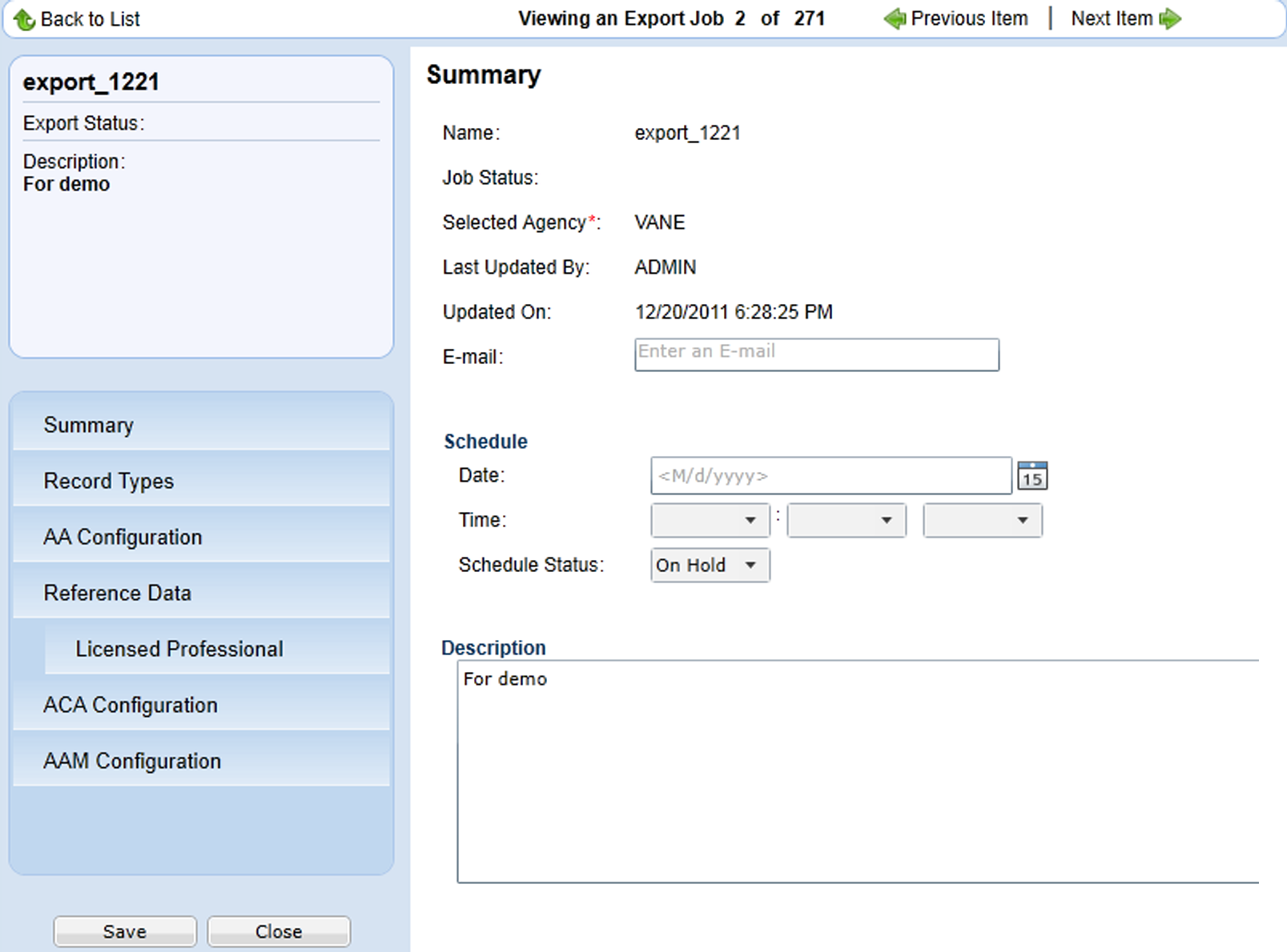 This section describes how to create an export job, configure the data elements for export, and run the job. You can schedule the job to run at a specific date and time. You can also manually run the job.