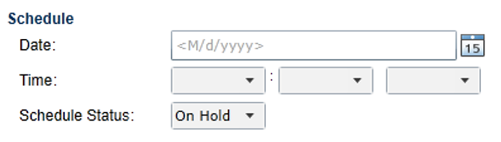 Schedule Status Select the status as On Hold or Active. If the status is On Hold, you can only save the export job, but cannot run it, either on the scheduled time or manually. If the status is Active, the export job runs on the scheduled time. You can also run the job manually.