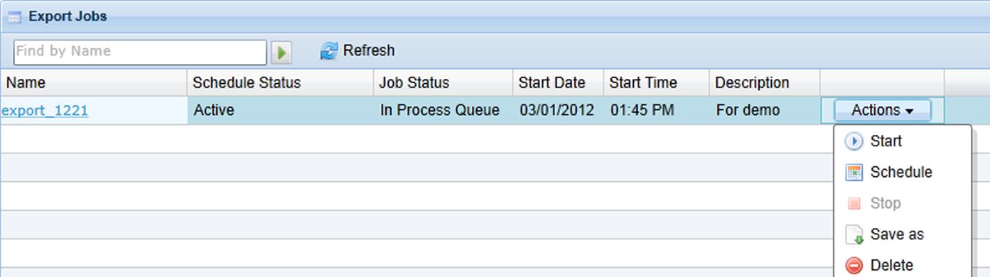Use the export jobs Actions menu in the list of existing export jobs (see Figure 1) to manage and run export jobs. You can use the Actions menu to start and stop an export job, schedule an export job, delete an export job, and download an export job to your local drive.