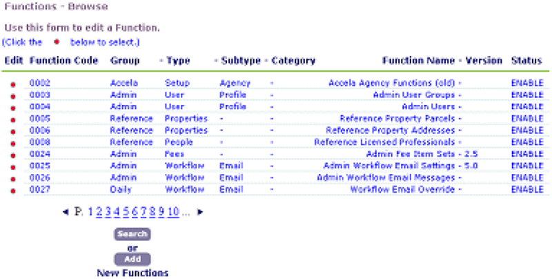 Display Text The function title. Function Name A short description of the function. Function Version The function release version. Function Group Whether the function is an administrator, daily, or reporting function. Function Type The major feature that the function supports (typically the main-level menus that appear throughout Civic Platform, such as Application or Workflow). Function Subtype A more specialized function within the function type. Function Category A specialized function within a function subtype (used very infrequently as most functions fit within three levels). URL The address of the page containing the function. Civic Platform calls this URL for the function. Display in User Group Whether the function is visible to general users. Description Any comments about the function. Status The enabled or disabled status.
