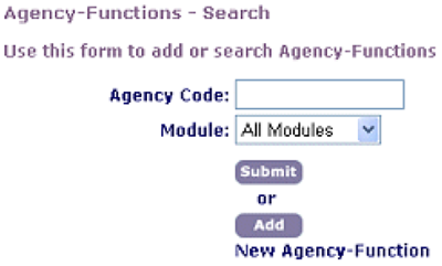 - On the Agency-Functions - Search page, enter all or part of the agency code.