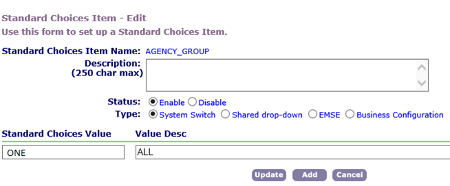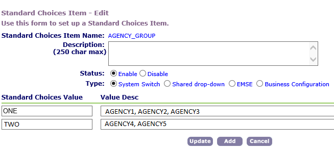 - In the Standard Choices Value field, enter the SERV_PROV_CODE of the parent agency.