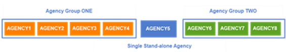 This illustrates a mixed-mode setup with 8 agencies (2 groups and 1 standalone agency) hosted in the same database: