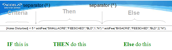 Script Control Structure (if/then/else) says, “If Acres Disturbed is less than 5 then assess but do not invoice the SMALLACRE fee, else assess but do not invoice the BIGACRE fee.”