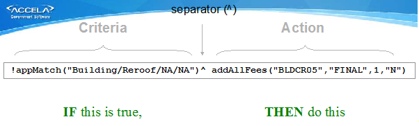 Script controls use the caret (^) symbol to delimit the if clause (predicate) from the then clause (consequent) and the else clause (alternative) in a single conditional expression. Civic Platform interprets the first clause as the if clause, the second clause as the then clause, and the third (optional) clause as the else clause.