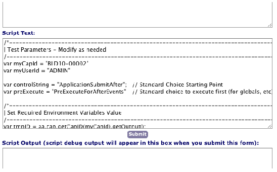 Civic Platform provides the ScriptTester.js master script file for you to test script controls without triggering an event from the user interface. You can copy and past the content of the ScriptTester.js file into the Script Test tool.