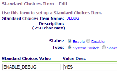 Set the DEBUG Standard Choice with the following settings (DEBUG standard choice):