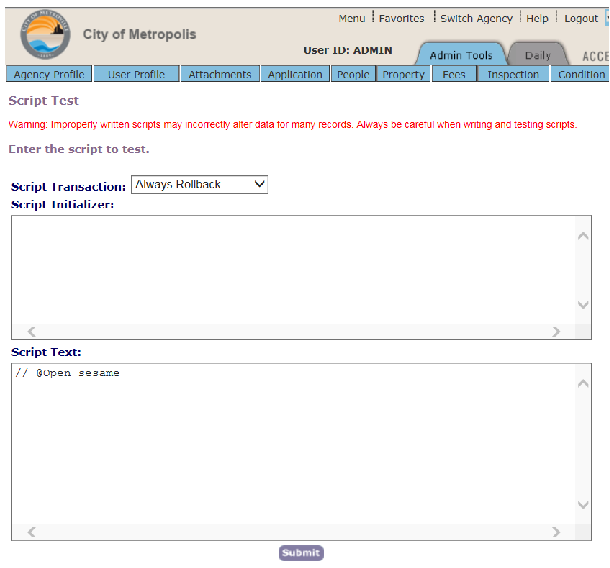 Civic Platform provides an EMSE debug tool so that users can debug scripts conveniently. Follow the instructions to launch the EMSE debug tool.