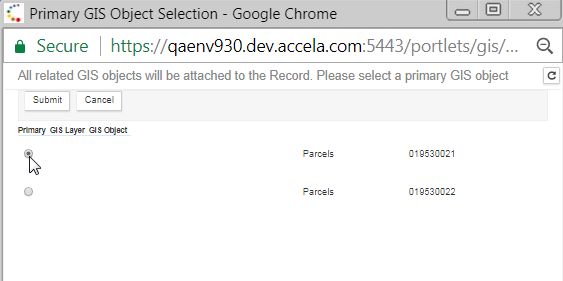If you selected multiple GIS objects, Civic Platform prompts you to choose the primary GIS object. For example: