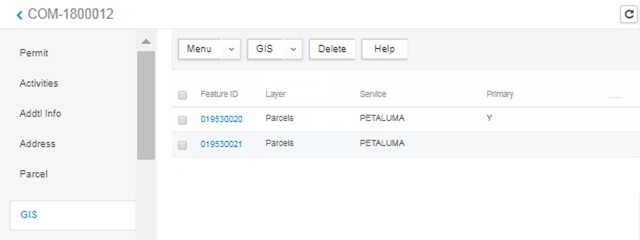 The GIS section shows the selected GIS objects that have been attached to the record. The following sample diagram shows the two selected parcels that are now attached to a record: