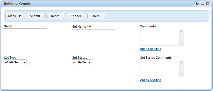 Set ID Civic Platform automatically generates a default code for the Set ID. If you want to change the set ID, enter an alphanumeric code. For example, enter “EDP.” After you save a new set, you cannot change the Set ID. Set Name Enter a name to identify this set. Civic Platform permits duplicate set names. Comments Enter commentary as needed. For example, you can summarize the purpose for creating the set. Set Type Select a set type from the drop-down list. The set type defines who has permissions to work with a set, what scripts are available for the set, and which values for Set Status are available. Set Status Select a status describing the set from the drop-down list. The available status options vary, depending on set type. Set Status Comments Enter commentary about the set status as needed. Click Submit.