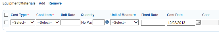 Complete the fields with available data. See Equipment and Material Cost Fields for a list of fields and definitions.