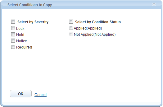 For example, if you click the Select link for Conditions of Approval, a dialog displays, prompting you to select which conditions to copy both by severity and by condition status.