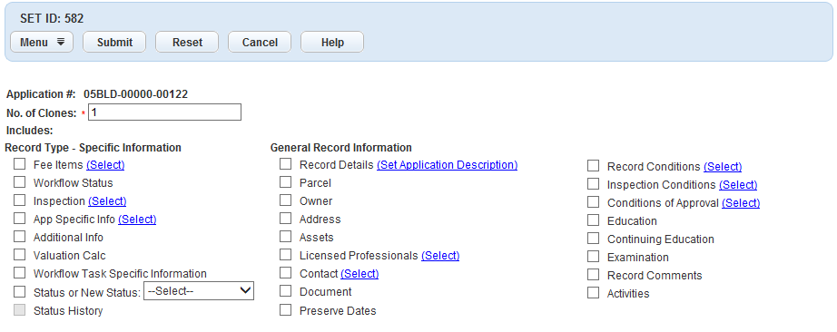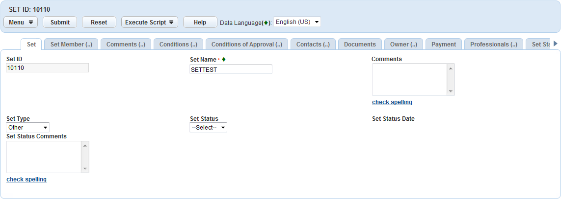 Sets enable you to group related records, parcels, addresses, or licensed professionals so that you can process the group as a batch. The topics in this section discuss many of the actions that you can perform while maintaining your sets.