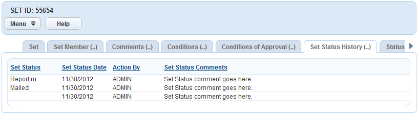 The display includes the following columns of data: Set Status, Set Status Date, and Set Status Comment.