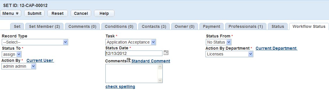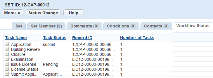 When you change the status of a set, Civic Platform applies the change to set members simultaneously and also displays the new status on the Status tab for the set.
