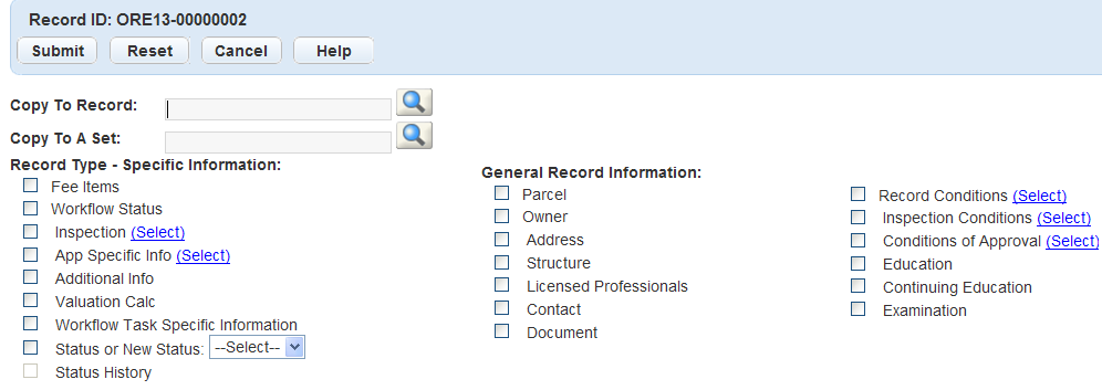 You can copy any data collected on an existing work order to one or move existing work orders, including Fee items, Workflow status, Inspections, Application-specific information, Workflow-task-specific information, Parcel information, People information, and Conditions.