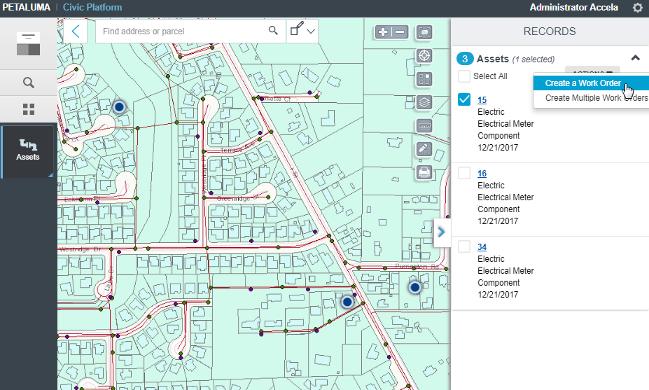 If your agency has Accela GIS, you can also use it to create work orders. An advantage to this is the ability to create multiple work orders for multiple assets at one time. It also provides a visual of the assets and their location.