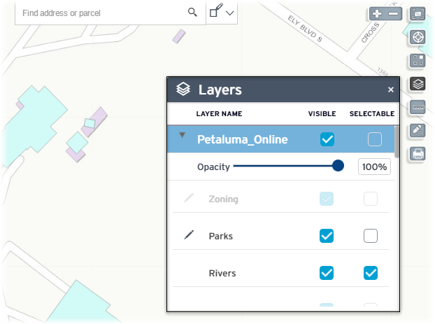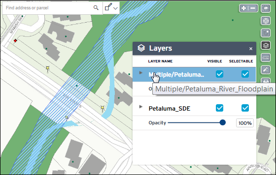 following sample Layers widget shows the sample Multiple/Petaluma_River_Floodplain