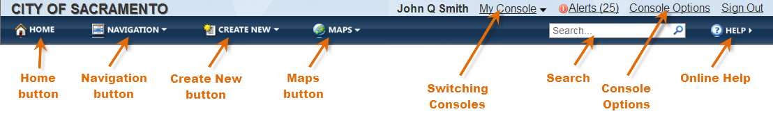 You can access frequently used portlets and record forms from the Civic Platform console by using the toolbars, main links, and administrative setup menu.