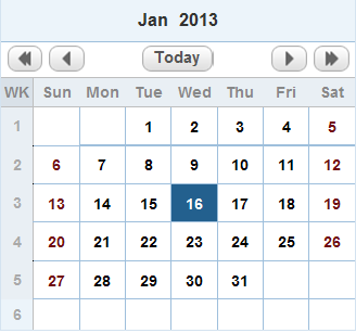 The current date is highlighted. Use the << and >> buttons to display the same month in the next/previous year. Use the > and <buttons to display the next/previous month. To choose a different day, click the date you want.