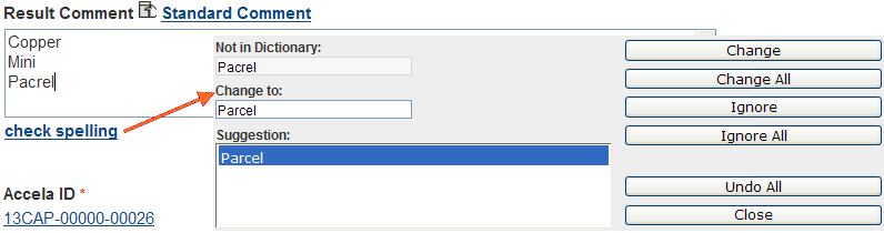 2. Use the buttons in the spell checker to check/correct your spelling. See Spell Check Fields and Buttons for more information.
