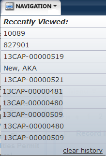 Use the Navigation button in the toolbar to access a drop-down list of the most recent records/objects you viewed or worked with in Civic Platform, newest to oldest (deleted objects not included). Each object listed is a hyperlink that you can click to open the named object or record.