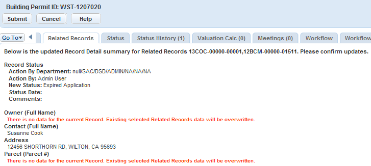 Civic Platform prompts you to confirm that you want to change the selected data for the related record.