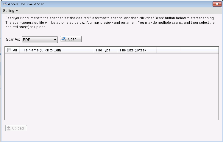 The Accela Document Scan window displays. Instructions for setting up the scanner may display at the top of the window.