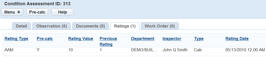 You can view an asset’s current rating and other rating details in the Ratings tab on the Asset Condition Assessment portlet. You can also see whether the current value is a pre‑calculated value or if the current value is a rating triggered by completion of a condition assessment. See Pre‑Calculating a Condition Assessment Rating for information about pre‑calculated ratings.