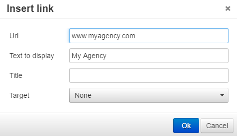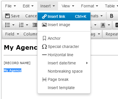 2. Enter the text that you want to use as the base for your hyperlink. For example, if you want to create a hyperlink to your agency’s website, you can enter your agency’s name.