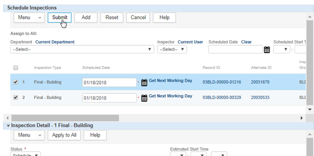 Review the inspection details, edit as necessary, and click Submit to schedule the inspection: