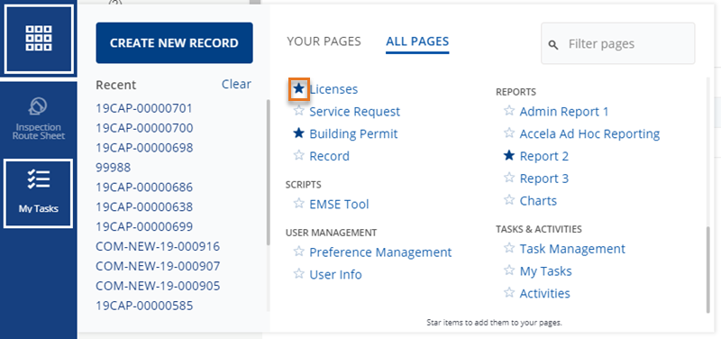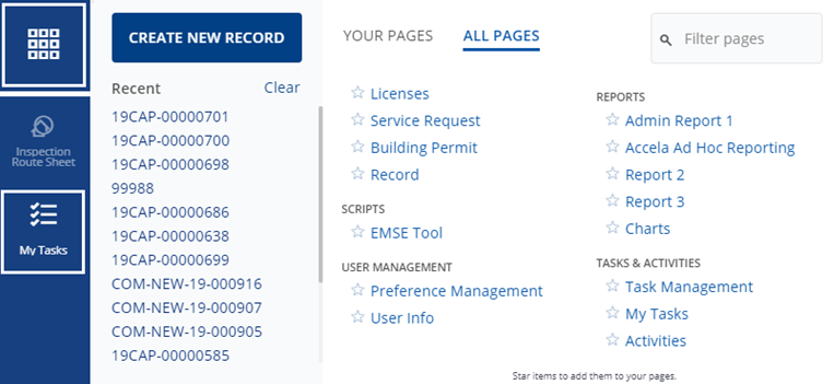 The All Pages section shows a complete list of the available pages (or portlets) that the user has access to. These pages display in two columns, grouped by category, sorted alphabetically across from left to right, then up and down. Select the star for a page to make it appear on the Your Pages list.