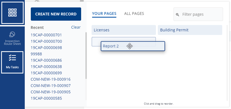 Click the CREATE NEW RECORD button to create new records. See Civic Platform User Guide - Records - Creating New Records in Oxygen UI to learn more.