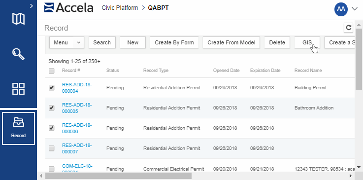 2. Select the records you want to plot, and click GIS. The following example shows a list of active records