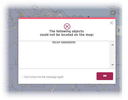 • If any of the selected items from the list could not be plotted on the map because they do not have associated GIS objects, a message window appears with the list of unplotted items. Example: